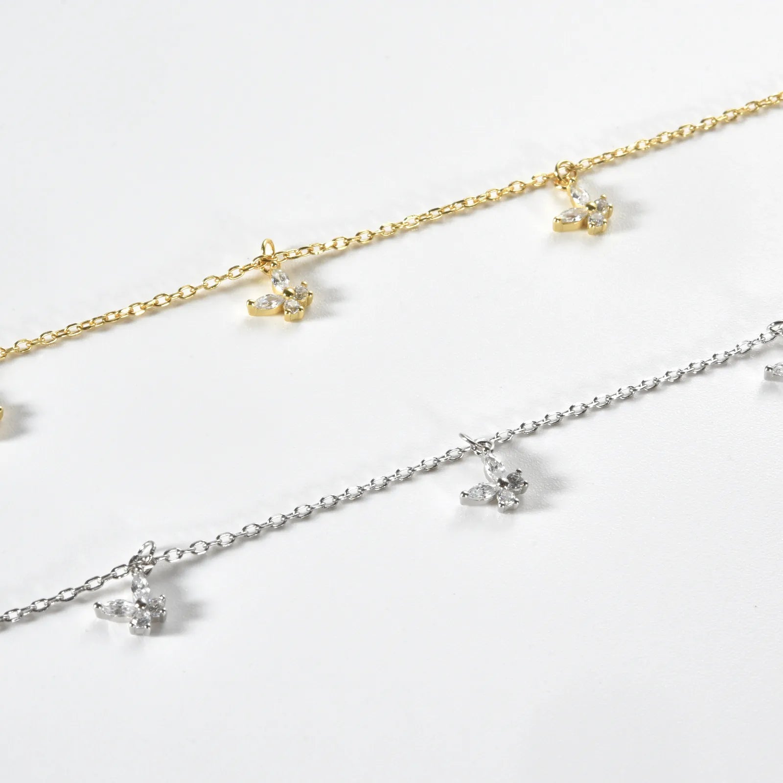 Light-catching butterfly charms dance along a fine chain for a soft, feminine glow. Crafted in sterling silver with a durable plated finish and an adjustable fit, it layers beautifully as a charm necklace or a close-fit choker necklace. Pair with gold earrings for women, stud earrings, or silver earrings for women, and finish with a ladies gold chain or slim gold chain.
