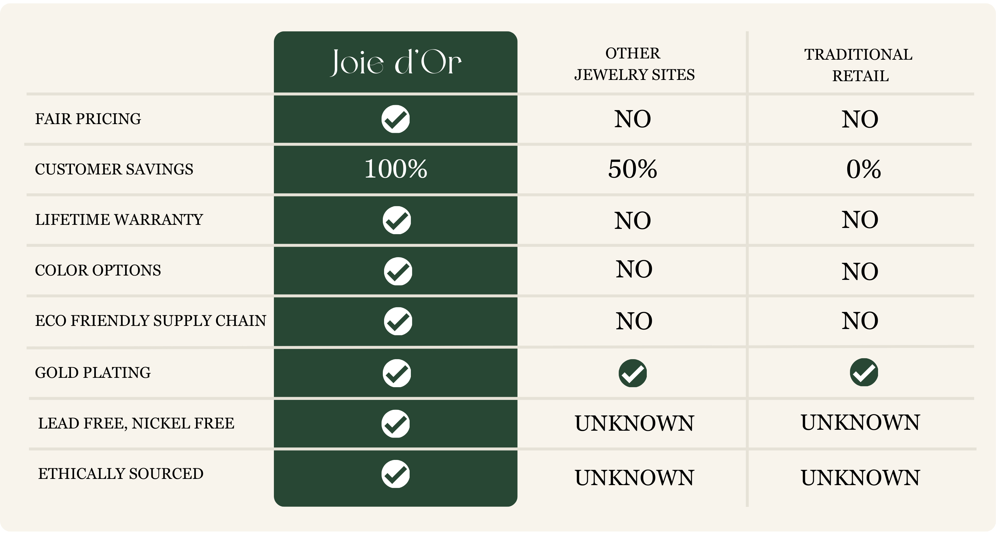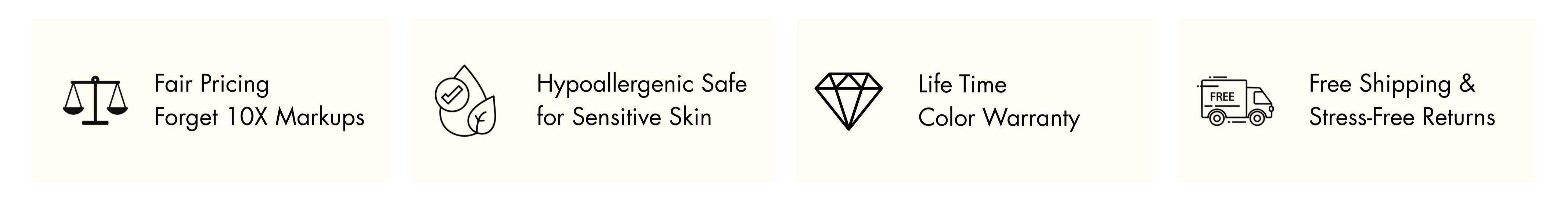 We feel confident that our jewelry won't lose color over time. In fact, we feel so confident about the quality that we'll provide you with a lifetime warranty on all gold or silver color issues.